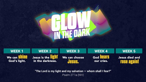 In the dark, a world of neon colors comes to life. Whether it’s the soft green of glow-in-the-dark stars or the bright colors of bioluminescent creatures, light can break through the darkness. When the world needed some light, God sent Jesus because he glows in the dark, and he can teach us how to shine with God’s light, too! In this five-week series through the Gospels, we’ll follow Jesus’ life leading up to Easter to see some of the ways he can shine bright in our lives. As we explore, we’ll see Jesus is the light in the darkness. We’ll also learn how we can choose Jesus and know God hears our cries while celebrating how Jesus died and rose again!